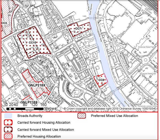 A total of 40 - 50 dwellings was proposed for the whole (extended) site. Only the King Street Stores site, for a total of 20 dwellings, was carried forward to the GNLP call for sites Regulation 18 document under the reference CC8. This has been carried forward to the Part 2 Site Allocations.