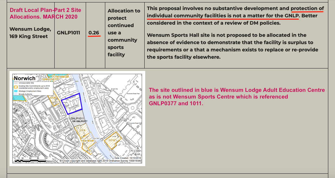 Please note, as indicated on the attached plan, the title 'Wensum Lodge King Street' does not equate to the description under the heading 'Reason for not Allocating'. Wensum Lodge Adult Education Centre King Street is outlined in blue. Wensum Sports Centre is described under GNLP0377 (however, as noted above, the title of 0377 is incorrect).
